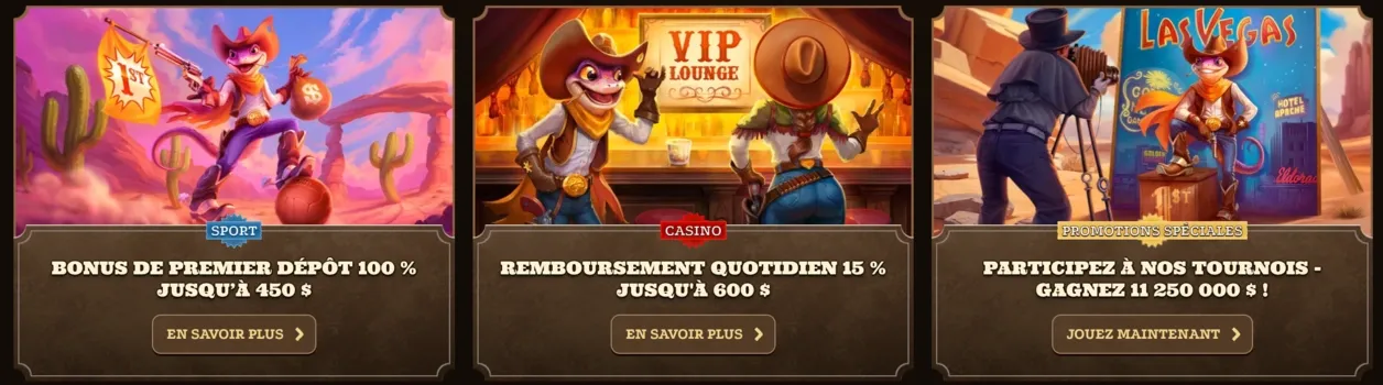 - 100 tours gratuits répartis sur 4 jours : En plus de ce bonus incroyable, nous vous offrons 100 tours gratuits pour jouer à l’une de nos machines à sous les plus populaires, Buffalo Trail. Les tours gratuits sont répartis sur 4 jours (25 tours gratuits par jour). Cela vous permet de profiter de vos tours gratuits progressivement, vous offrant ainsi plus d’opportunités de gagner.